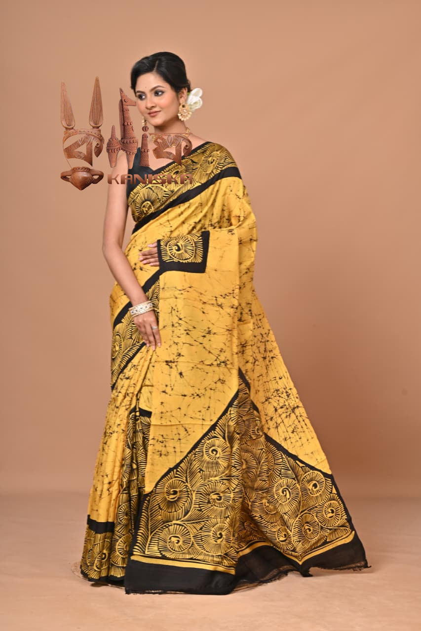 Soru Tuli Batik Silk sarees feature intricate hand-painted batik designs created with fine brushes. The wax-resist technique reveals bold yet delicate patterns.