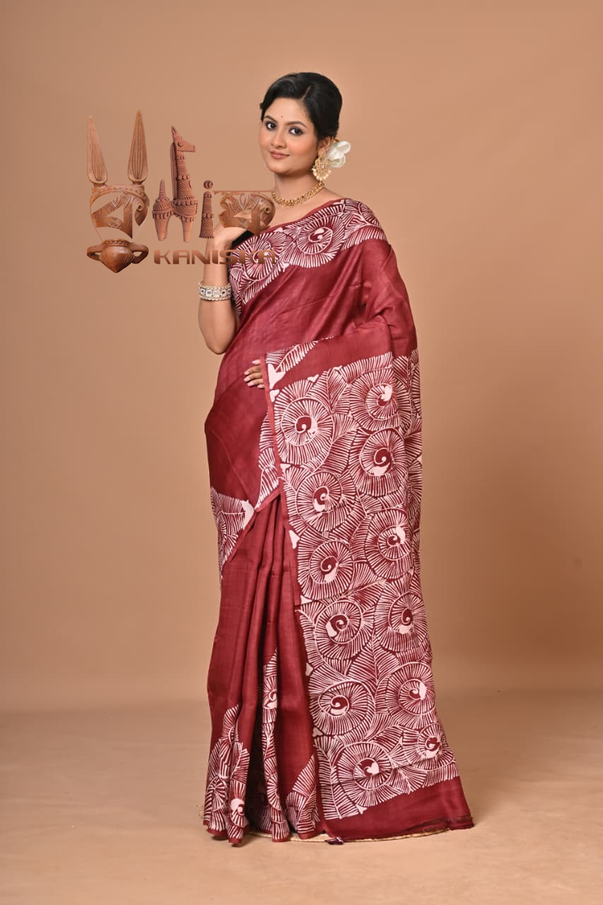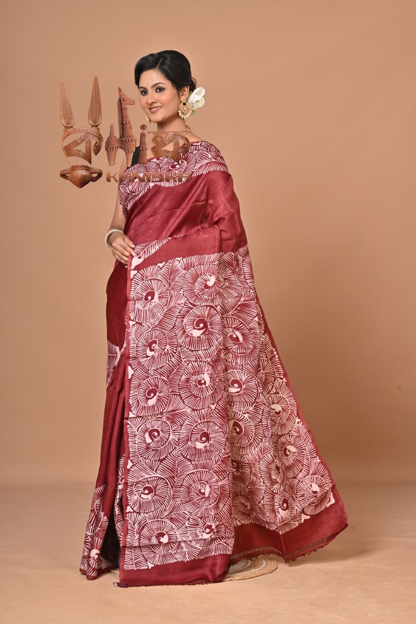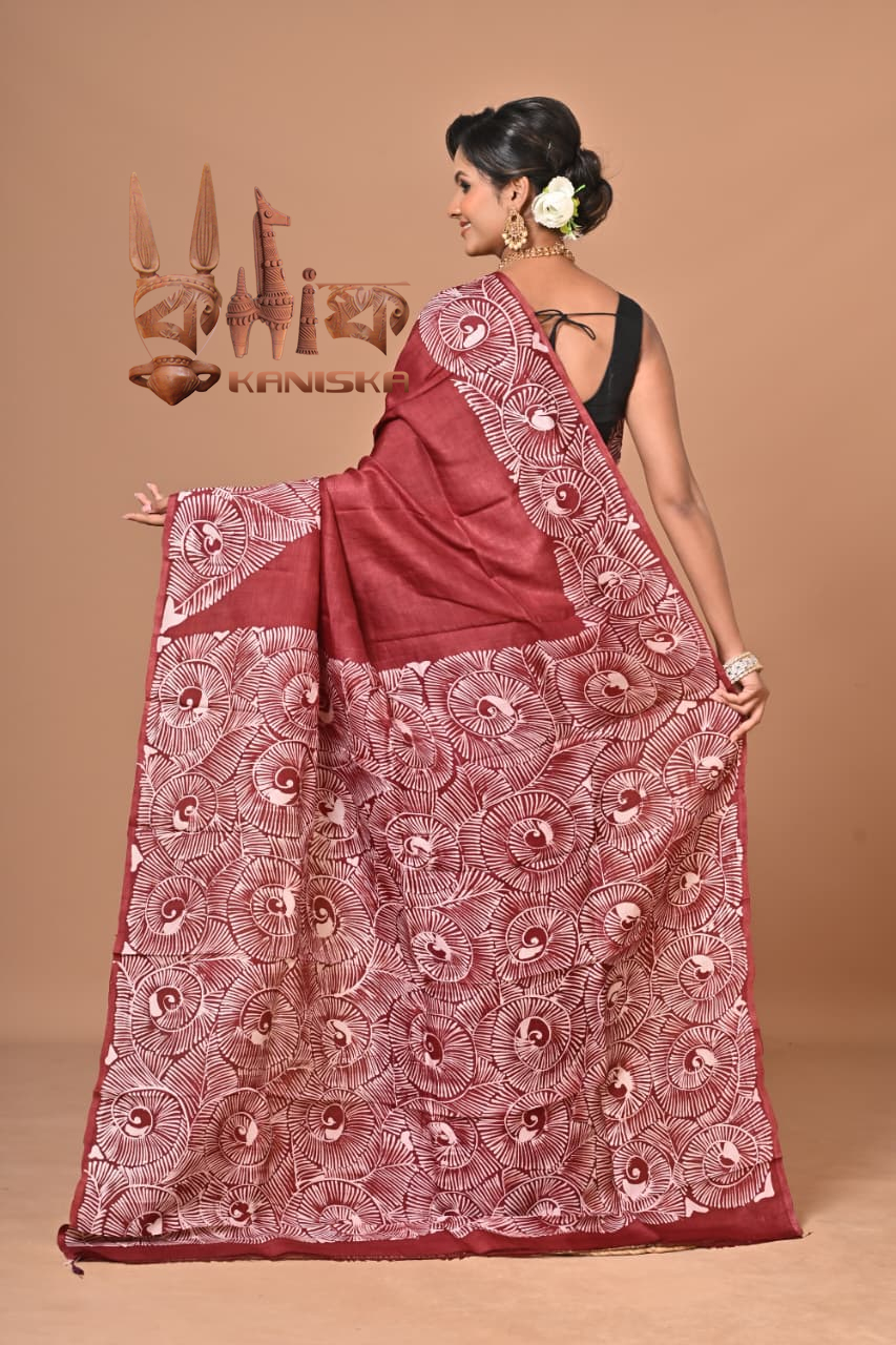 Soru Tuli Batik Silk sarees feature intricate hand-painted batik designs created with fine brushes. The wax-resist technique reveals bold yet delicate patterns.