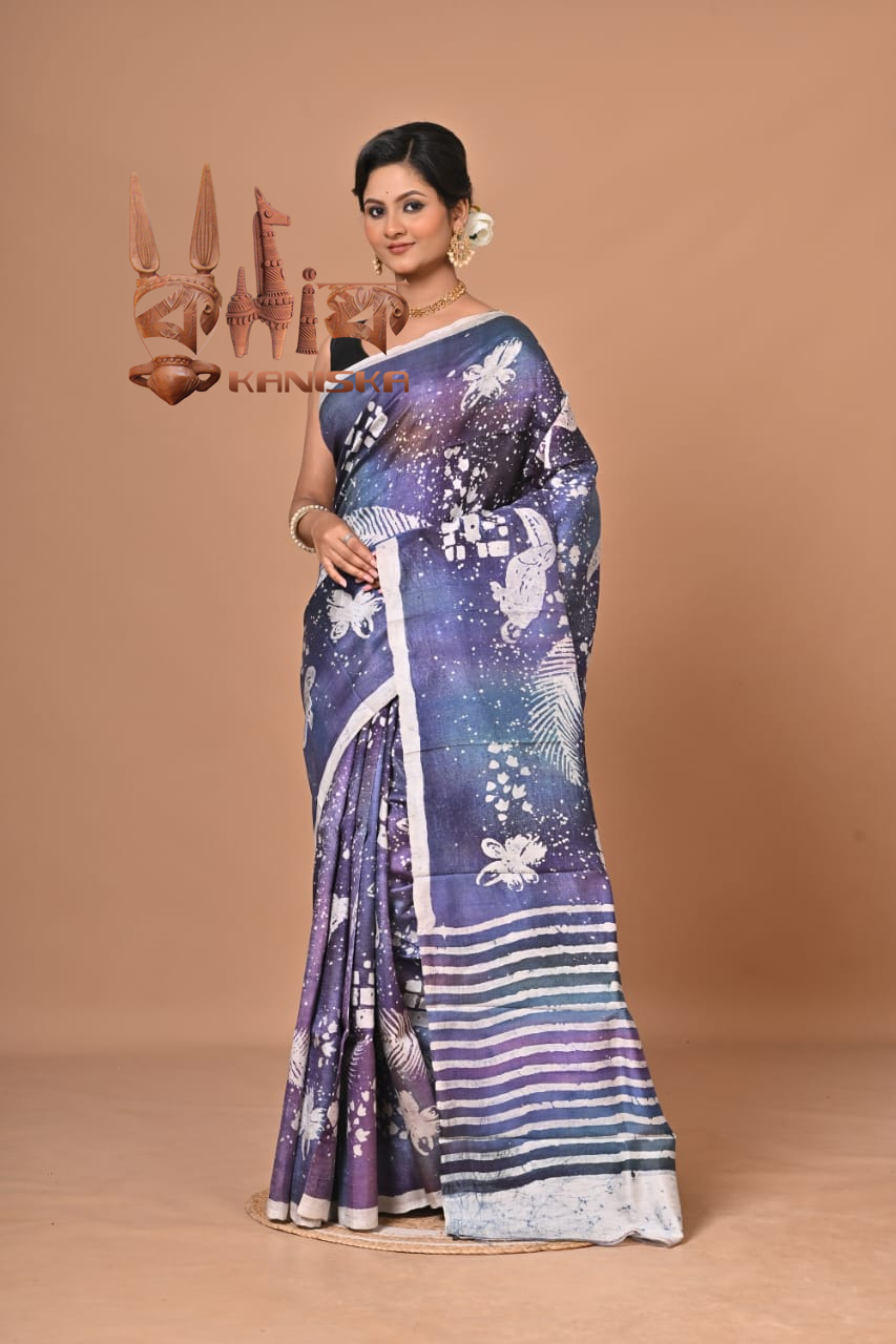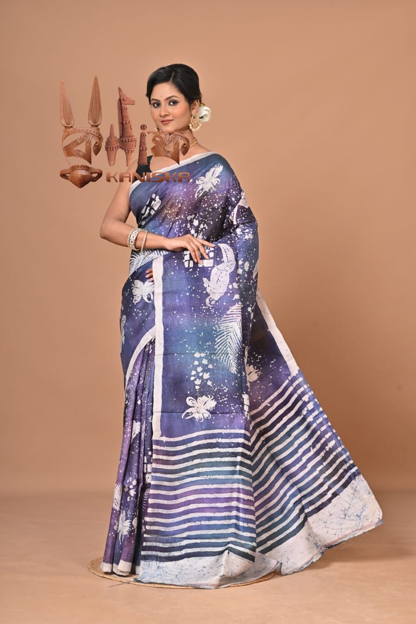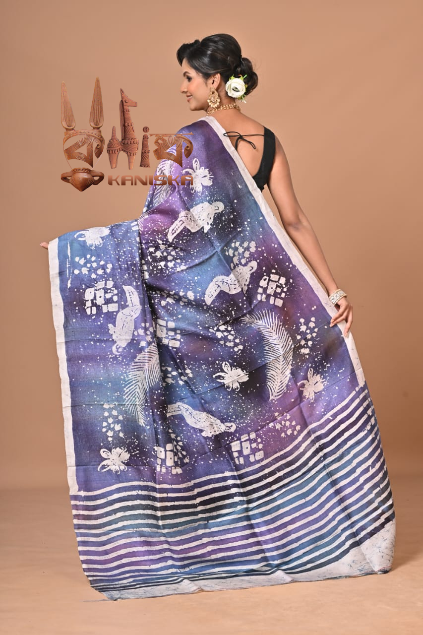 A Pure BISHNUPURI Silk Hand Batik Saree is a luxurious and artistic type of saree that combines the rich texture of pure silk with the intricate hand-batik dyeing technique